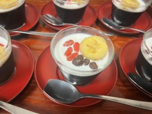 おやつは『珈琲ゼリー』です♪冷凍で冷やしたバナナと麦チョコとクコの実を添えました(*^-^*)
