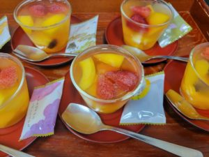 おやつは『フルーツいっぱいゼリー』です♡また、今日は、利用者の〇さんの娘様からおせんべいの差し入れがあり、おせんべいも皆様にお出ししました(*^-^*)