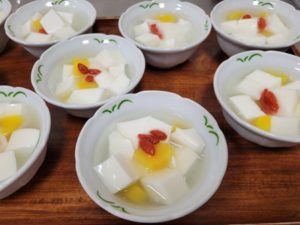 おやつは『杏仁豆腐』です♪桃の缶詰を使用しました(*^-^*)杏仁豆腐が濃くてなめらかで何とも言えない美味しさでした♡