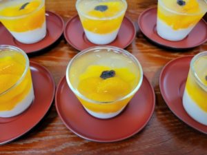 おやつは『2層ゼリー』です♪1層目は牛乳、2層目はミックスジュースにフルーツ缶を入れて作りました♪