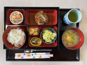 早速、今日の調理担当者に伝え、担当者が考え、その方には、デミグラスソースの代わりに、大根おろしとポン酢でご提供しました。(さすが~💡)