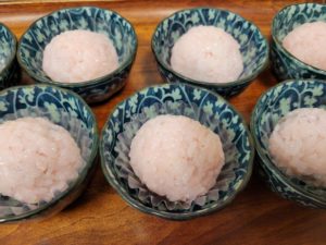 おやつは『さくらおはぎ』です。もち米を桜色に仕上げてあんこたっぷりで作りました♪