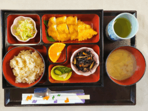 さくら御膳メインは『ささみのフライ』です。トマトケチャップとソースを合わせた特製ソースをかけてどうぞお召し上がりください。