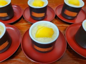 おやつは『柿のプリン』です。利用者の〇さんが、ご近所になった柿を沢山頂いたとおすそ分けで頂きました。