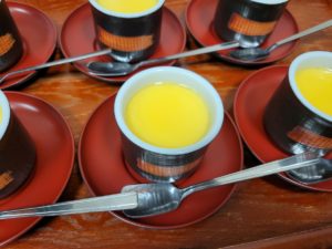 おやつは『温プリン』です。すだちを輪切りにしてオリゴシロップに漬けたすだち茶もお出ししました。