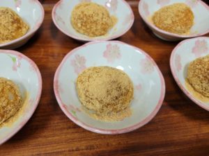 おやつは『金柑入り、きな粉団子』です。白玉粉を豆腐でこねて生地を作り、金柑の甘露煮をなかに入れ、茹でて、きな粉をまぶしました。