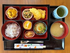 さくら御膳メインは『鶏むね肉の柔らか天』です。中央にあるすだちを絞って、どうぞお召し上がりください。