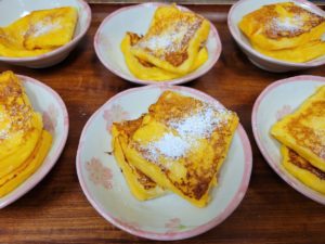 おやつは、卵、牛乳たっぷりの『フレンチトースト』です。温かいうちにどうぞお召し上がりください。