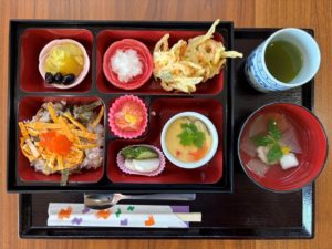 メニューは、ちらし寿司(干し椎茸、高野豆腐、あみえび、胡麻、錦糸卵、海苔、人参)、吸物、