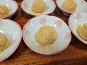 おやつは『金柑入りきな粉団子』です。さくらの丘の敷地内で採れた金柑の甘露煮をなかにいっぱい詰めて作りました♪