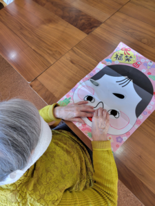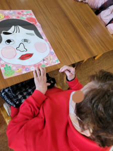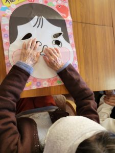 レクリエーションは、楽しみながら脳の回転を促しバランス感覚をつける目的で『福笑い』をしました。