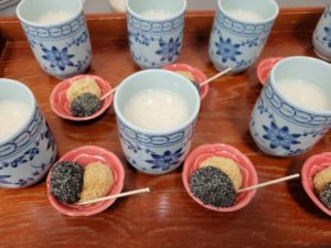 おやつは『甘酒&2色団子』です。1つは、黒ゴマ。もう1つはきな粉の団子です(*^-^*)