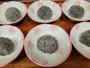 おやつは『栗・餡入り黒ゴマ団子』です!生地は豆腐で練り、たんぱく質も摂れます!