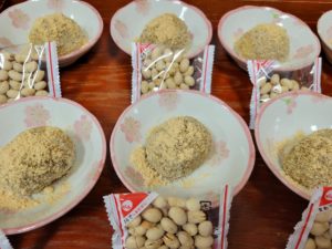 おやつは『栗入り白ごま・きな粉団子』です。節分のお豆も配りました(*^-^*)