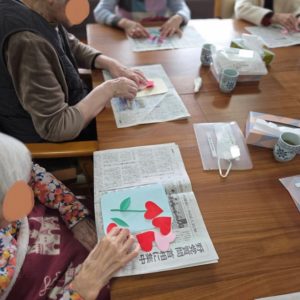 レクリエーションは、楽しみながら脳の回転を促す目的で『ペーパークラフト』をしました。